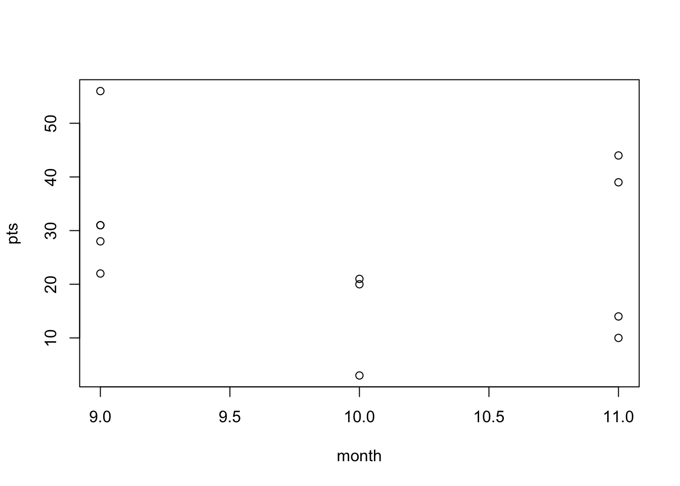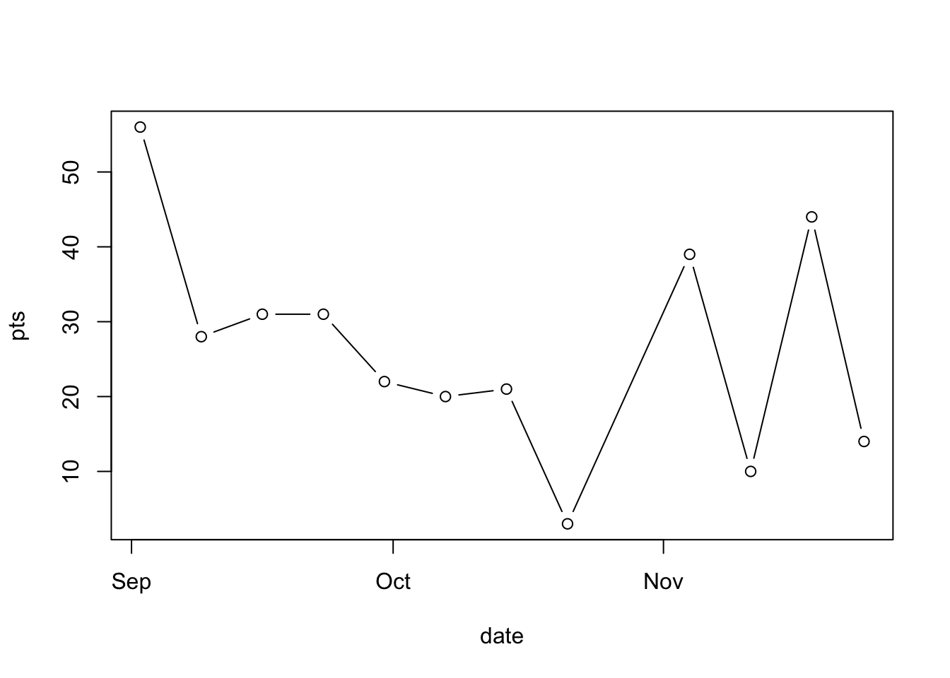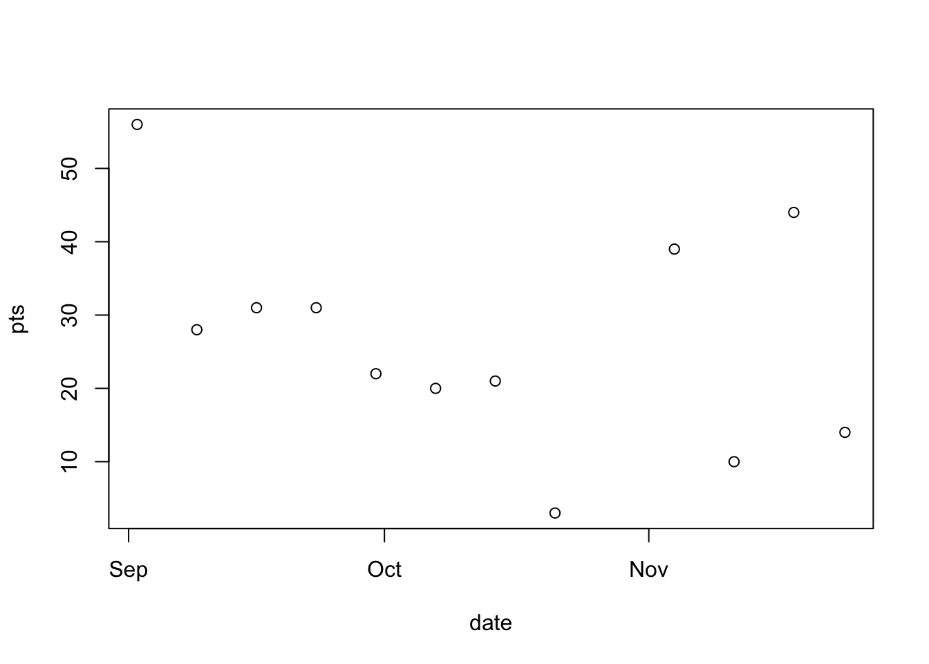 plot(pts ~ date, data = football)Error in plot.window(...): need finite 'xlim' values
