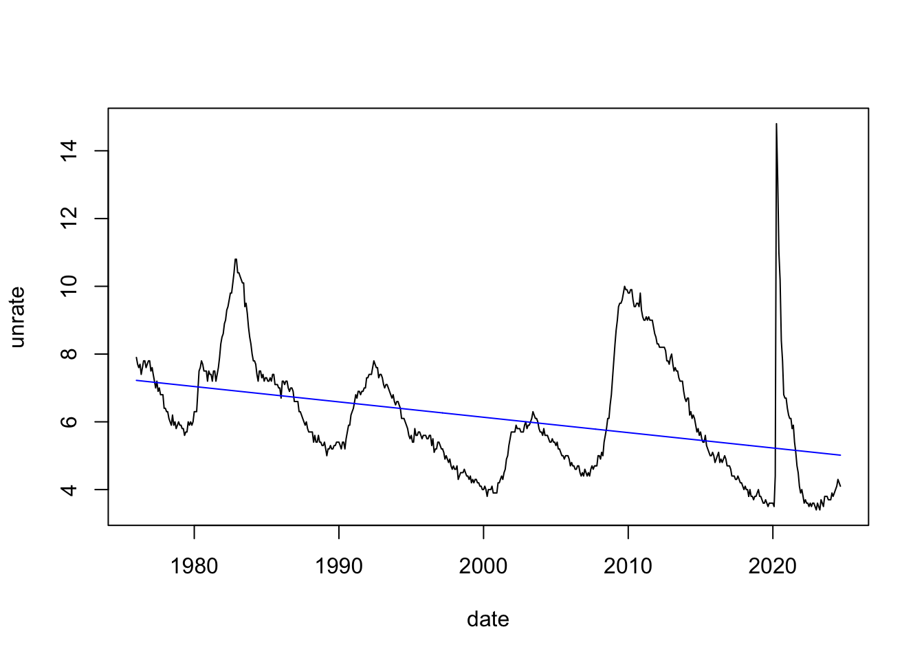 lines(unrate_linear_trend ~ date, data = unemployment, col = "blue")